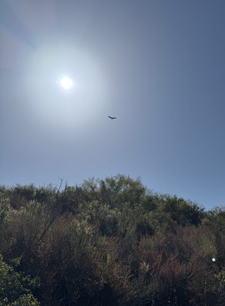 We stuck to the trail and scrambled down sandy gullies and over rocks and mostly stuck to the water’s edge. We heard native birds such as the wren tit, with its characteristic “dropping ping-pong ball” call and the spotted towhee, with its “mewing” calling. We saw the common chaparral resident, the California towhee as well as a turkey vulture soaring above.